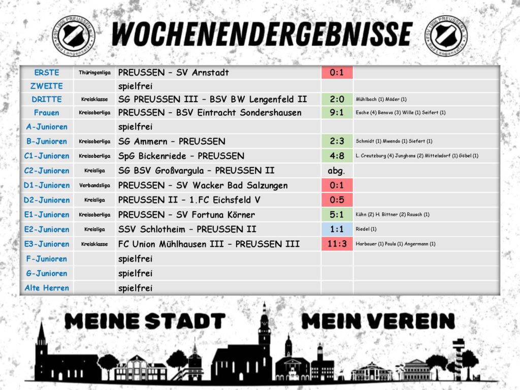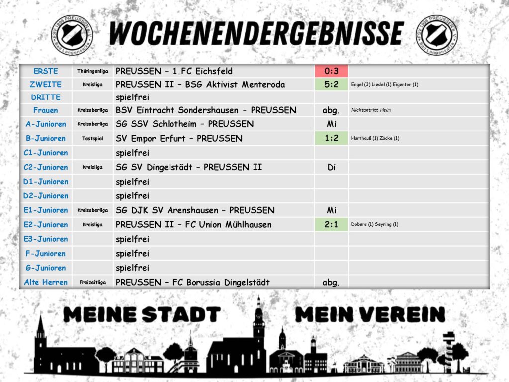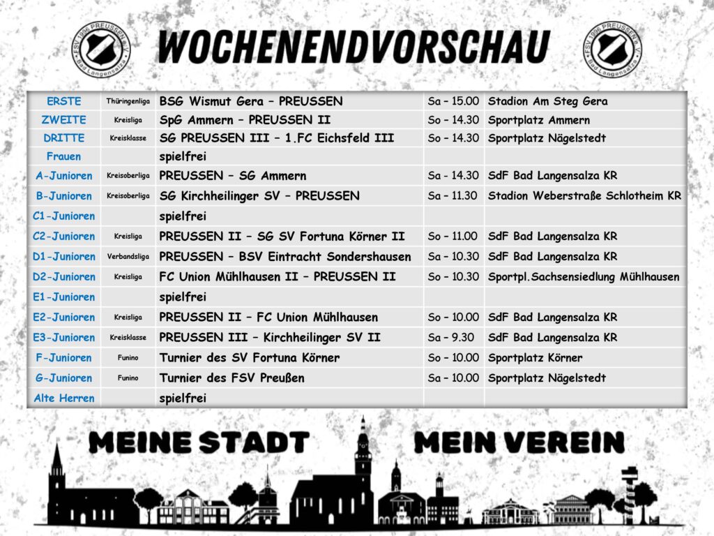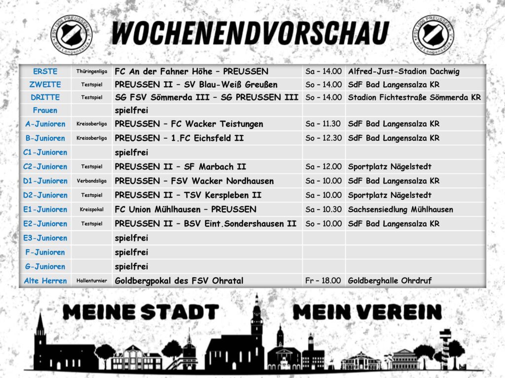 Die Thüringenliga-Mannschaft ist das Aushängeschild des FSV Preußen. Seit 2015 spielt sie in der höchsten Liga Thüringens und hat sich mit dem Einzug ins Thüringenpokalfinale 2019 im Erfurter Steigerwaldstadion einen Namen gemacht. Hier spielen viele Eigengewächse, denn auch hier gilt „wo Preußen draufsteht, steckt Preußen drin“. Mit der II. Mannschaft sowie der III. Mannschaft in Spielgemeinschaft mit dem SV Nägelstedt ist der Unterbau in den Ligen des Fußballkreises breit aufgestellt.
