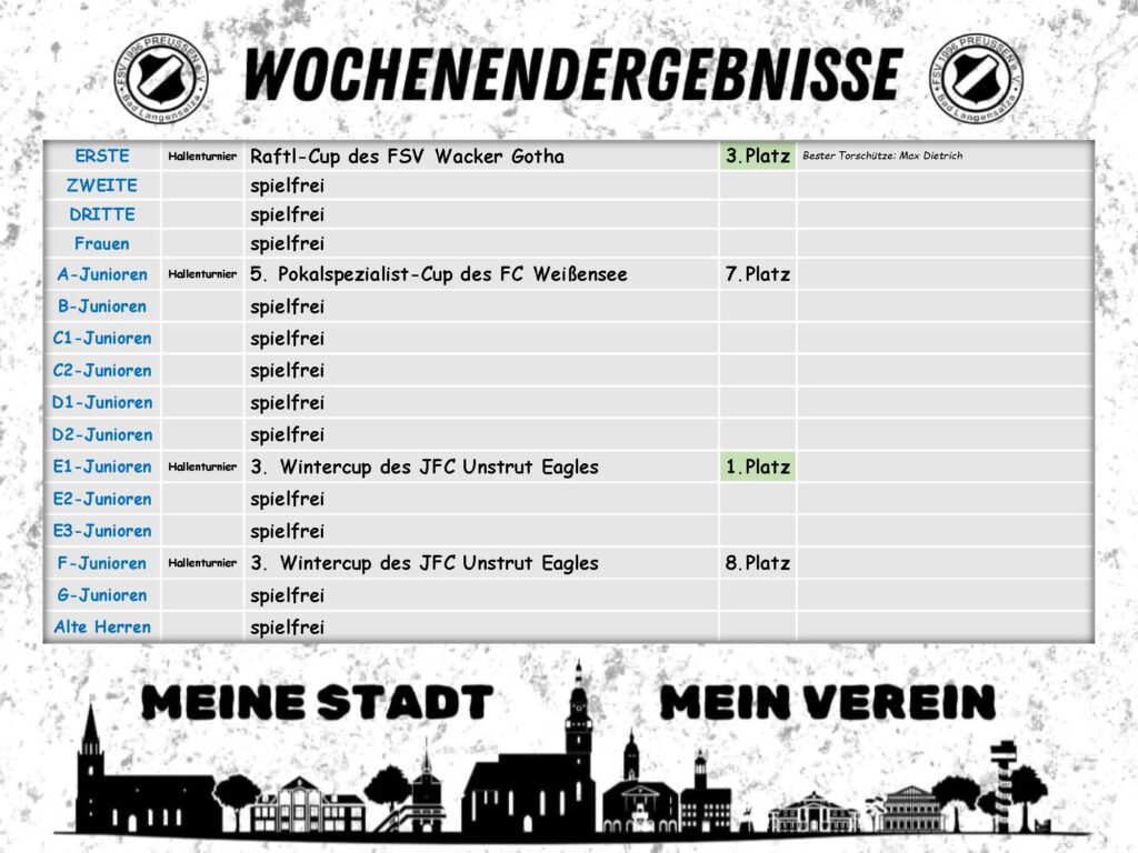 Während die A- und F-Junioren mit mäßigem Erfolg von ihren Hallenturnieren heimkehrten, ist der Erfolgshunger der E-Junioren mit dem vierten […]